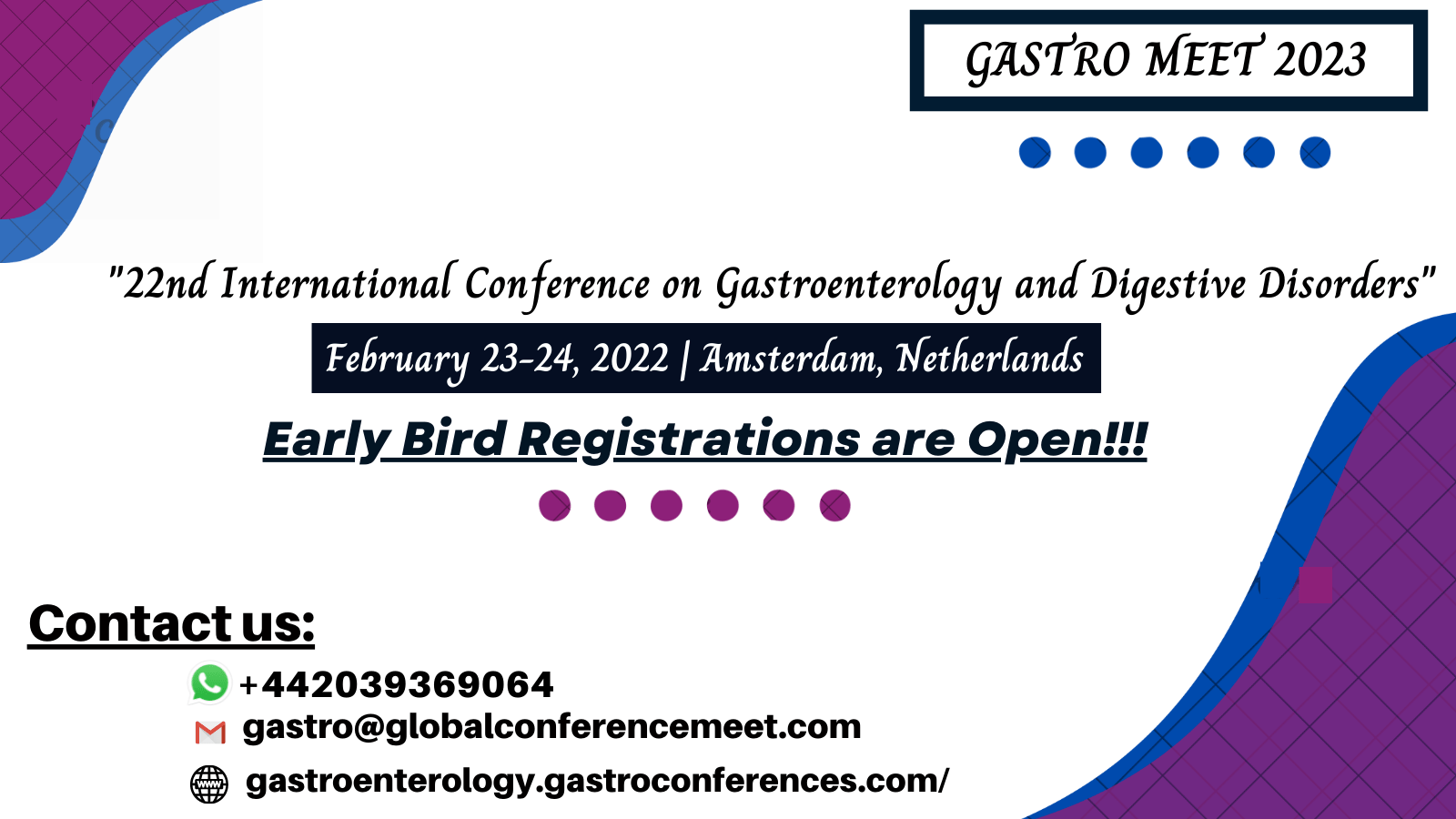 ME Conferences takes the privilege to welcome the participants from all over the world to attend the “22nd International Conference on Gastroenterology and Digestive Disorders” to be held during February 23-24, 2023 at Amsterdam, Netherlands. This Gastro Meet 2023 Conference will focus on the theme “Exploring the Advanced Trends in Treating Digestive Disorders” that provides a global platform to discuss about the present and future challenges across Gastroenterology, Digestive Disorders, Pediatric Gastroenterology and Nutrition, Advancements in Digestive Diseases etc.