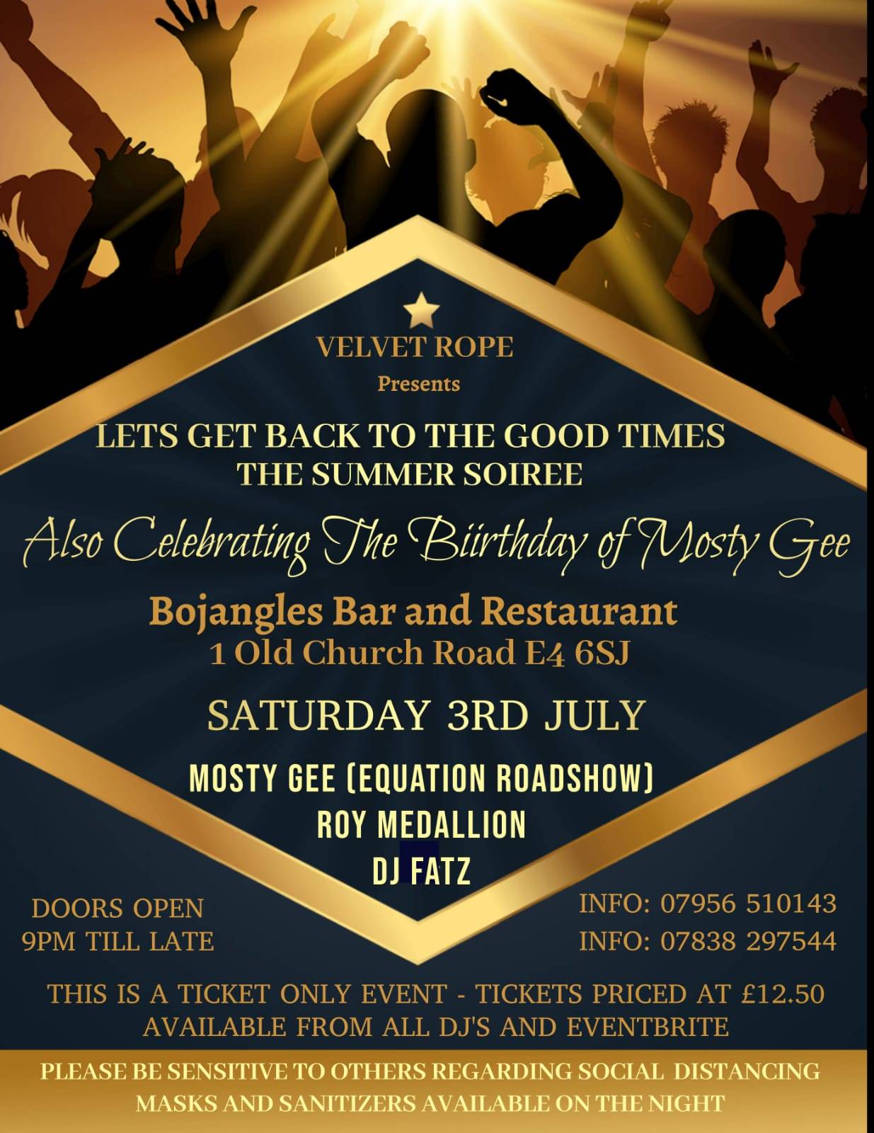 For the first time since the lockdown lifting, Bojangles invites you out to their pub in Chingford for a night of good fun with Mosty G, Roy Medallion and DJ Fatz this July!