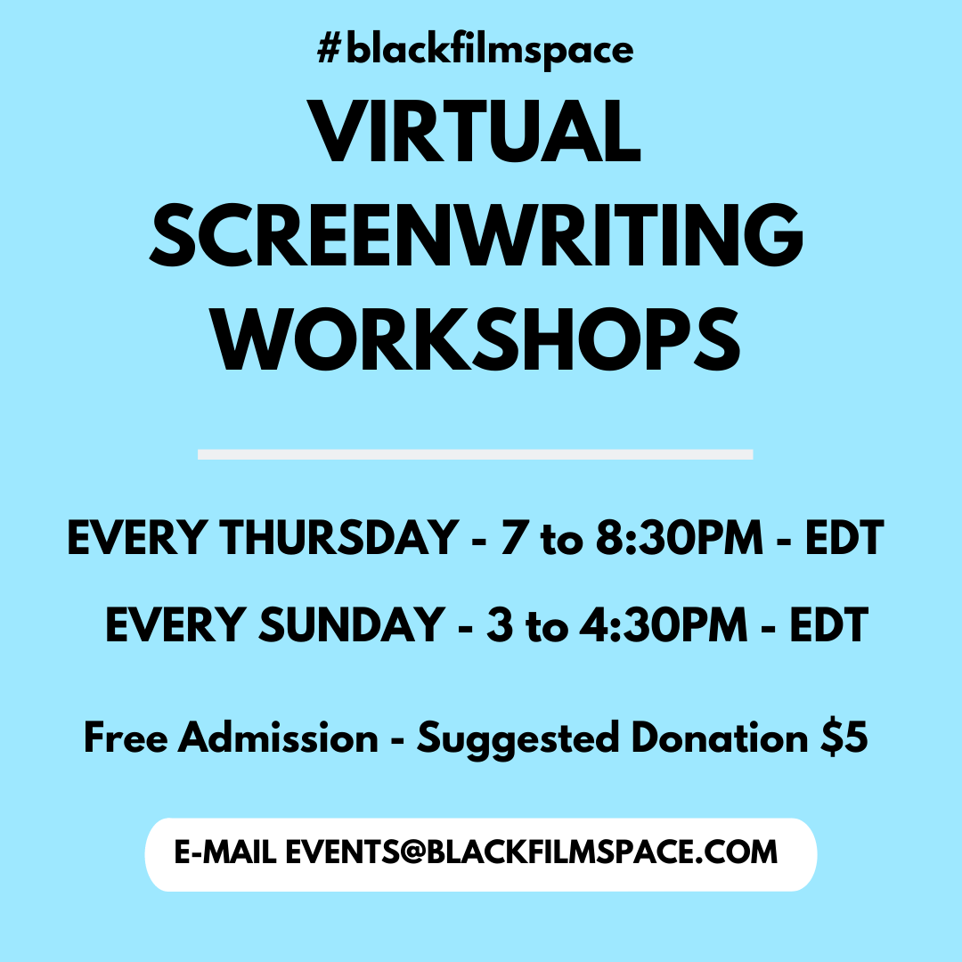 Due to the Covid-19 pandemic, we are hosting bi-weekly virtual screenwriting workshops via the video app Zoom. Please choose a day to RSVP!