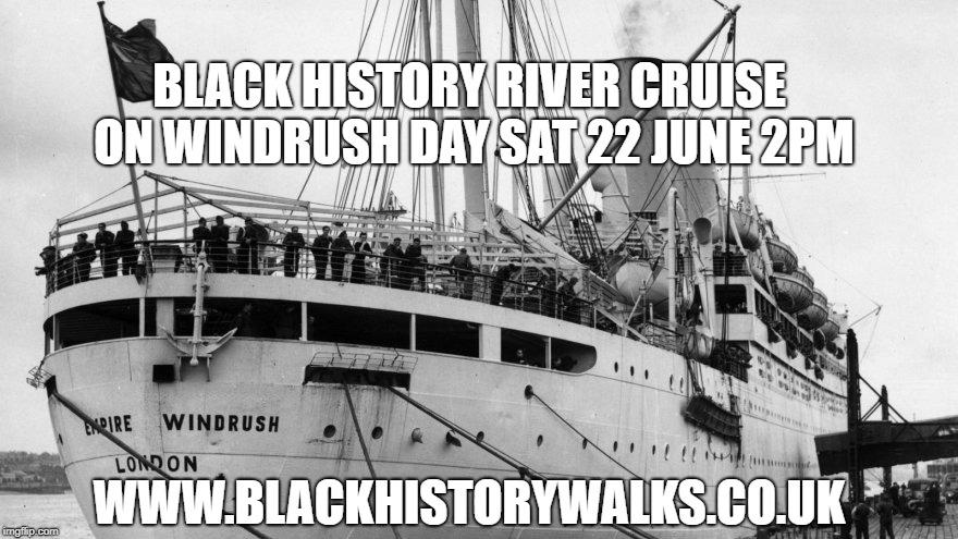 The cruise will cover African Romans, ancient African art/engineering, Black Spitfire pilots, lost sugar warehouses, the Ivory trade, African diamonds, African Odysseys on the Southbank, the Apartheid Millenium Wheel, Olaudah Equiano, Nigerian oil, 20,000 Black people and their Day of Action, Civil Rights in the UK, Mary Seacole, To Sir With Love, Brown babies and Jim Crow, The Palace of Stolen Goods, West India Docks, Canary Wharf’s African roots, Kings College’s Caribbean connection, Guys Hospital and who really paid for it, the colour bar in nursing, Black Merchant Mariners, the river as a sewer, Black Shakespeare, Tate & Lyle and the Sugar Girls, Barbados and the National Rail Network, the REAL pirates of the Caribbean and much, much more! On this day we will pay special attention to the Windrush generation.