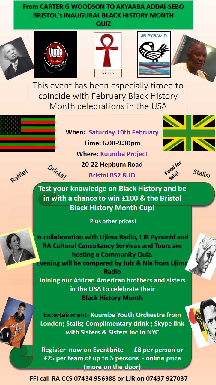 Enjoy a quiz night with a difference, celebrating our history from BCE to present day. This event has been specifically timed to coincide with US Black History Month celebrations in the USA. Entertainment from the talented Kuumba Youth Orchestra from London, stalls, raffle, and comperes Julz and Nia from Ujima Radio. There will be a live link with New York to talk about Black History Month and all ticket holders are entitled to a free drink upon arrival. On top of all that the winning team lifts the Bristol Black History Month Cup along with £100.