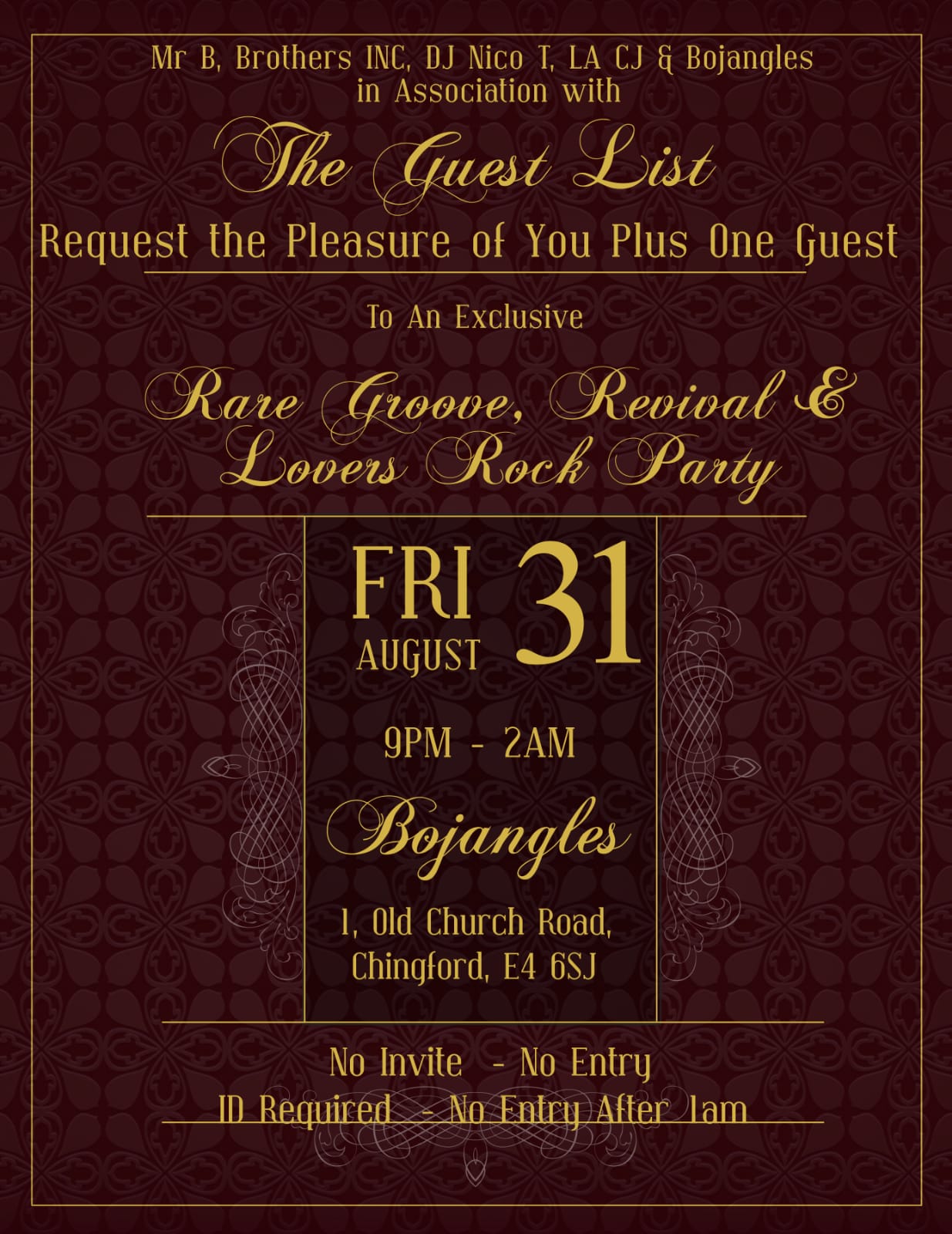 On Friday 31st August, Bojangles in Chingford E4 are having an exclusive Rare Groove, Revival & Lovers Rock party which is strictly by invitation only.