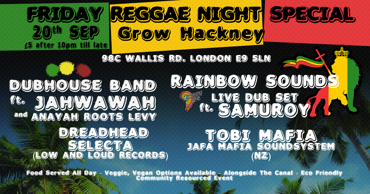 Grow is a bar, kitchen and creative space carved out of an old sausage factory by the River Lea in Hackney Wick. It is run as an experiment in ethical and sustainable business and works in partnership with local artists, musicians, DJ’s and community groups. Most events are free, from live jazz and blues, open deck reggae, open mic and art festivals. Grow exists for music, art, food, conversation, community and belonging. Everyone is welcome.