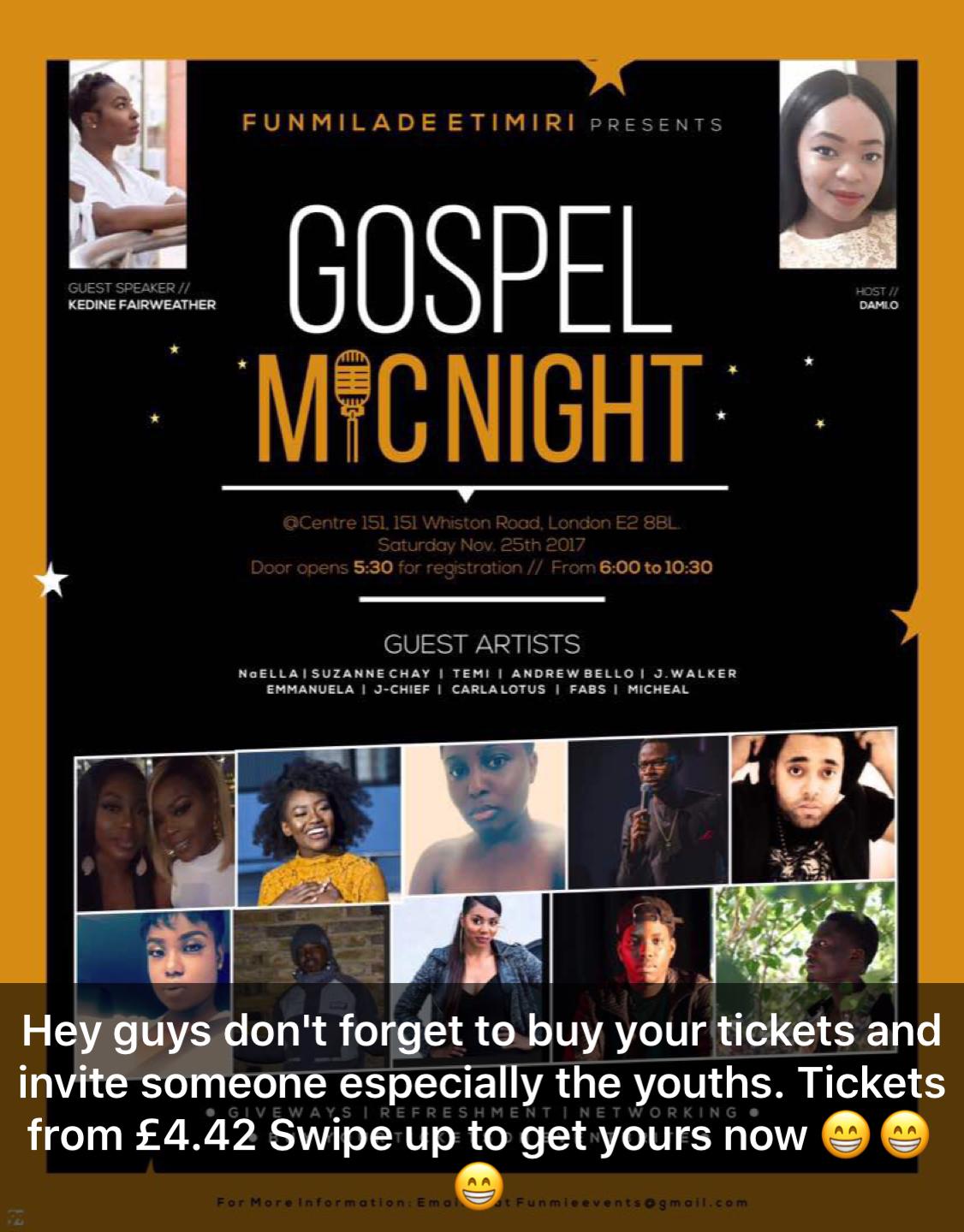 Funmilade Etimiri welcomes all to her first annual gospel mic night event taking place on Saturday 25th November 2017. The event hosted by radio produce and presenter Dami O, invites a number of gospel artists for the night to showcase their talents, inspire the youth and reach out to a wide range of people through gospel music. Gospel Mic Night 2017 aims to bring people together and to inspire and invest in the younger generation. Guest artists include – Andrew Bello, Fabz, NaElla, J- Chief, J. Walker of TLD, Suzanne Chay and many more! This event will be packed with interactive sessions, networking, ice-breaker games, raffle prizes, giveaways to be won, free food and more.