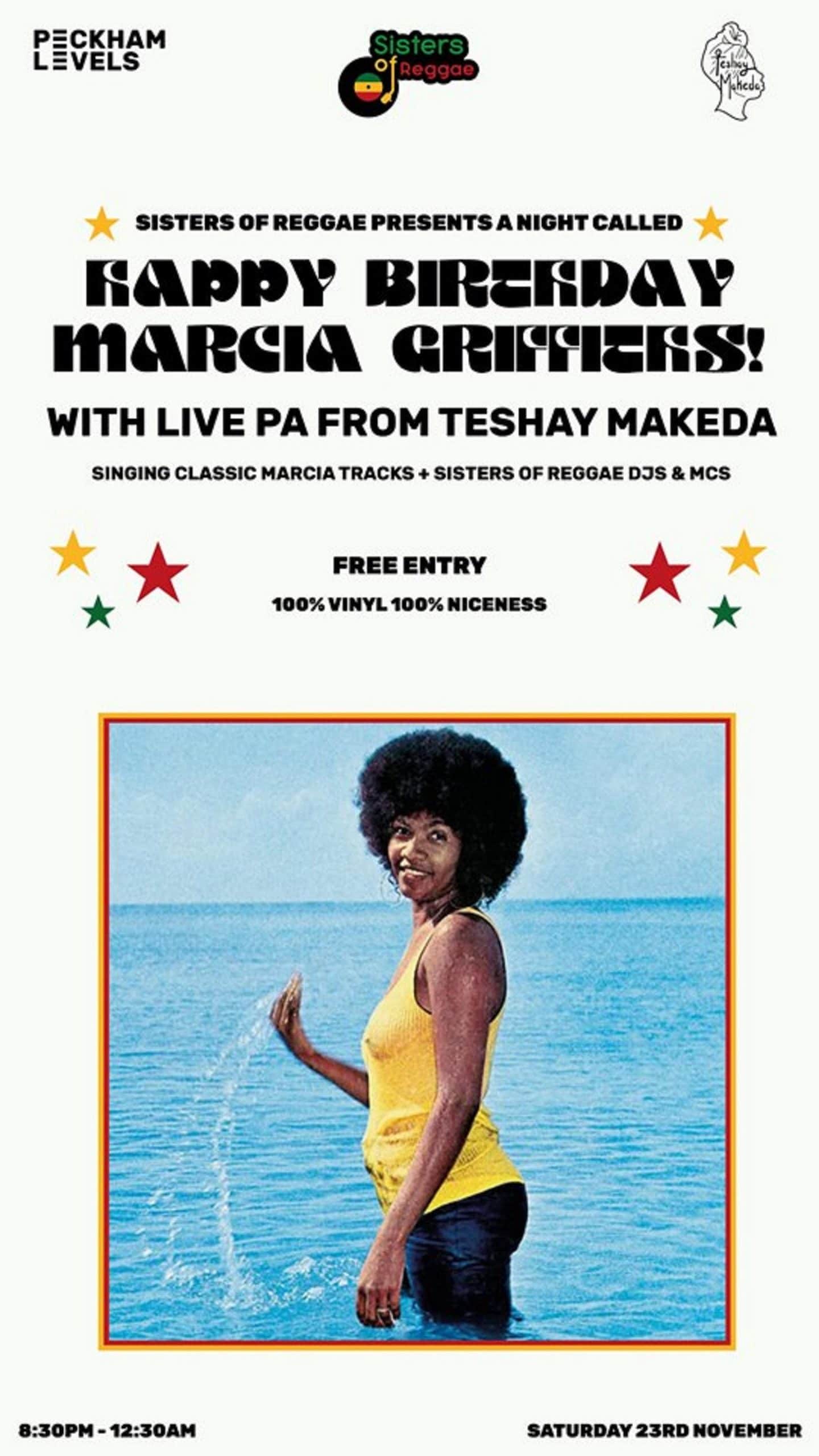 Sisters of Reggae celebrate the Queen of Reggae Marcia Griffiths with Teshay Makeda singing favourite tracks + her own songs & SoR DJs FREE