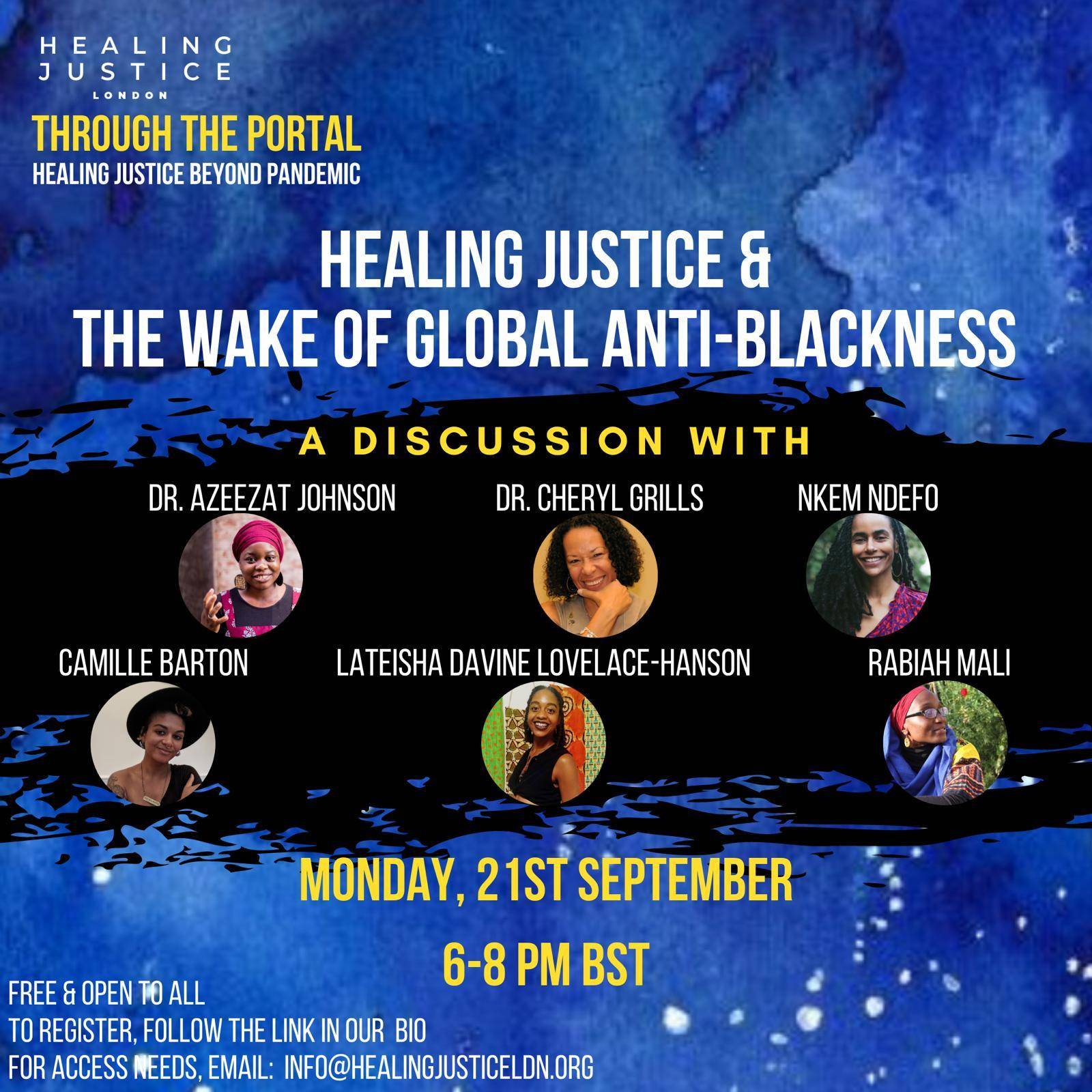 This is an online event and we will send link out prior to event. It will be recorded , transcribed with BSL. Please contact us for further access needs. Info@healingjusticeldn.org