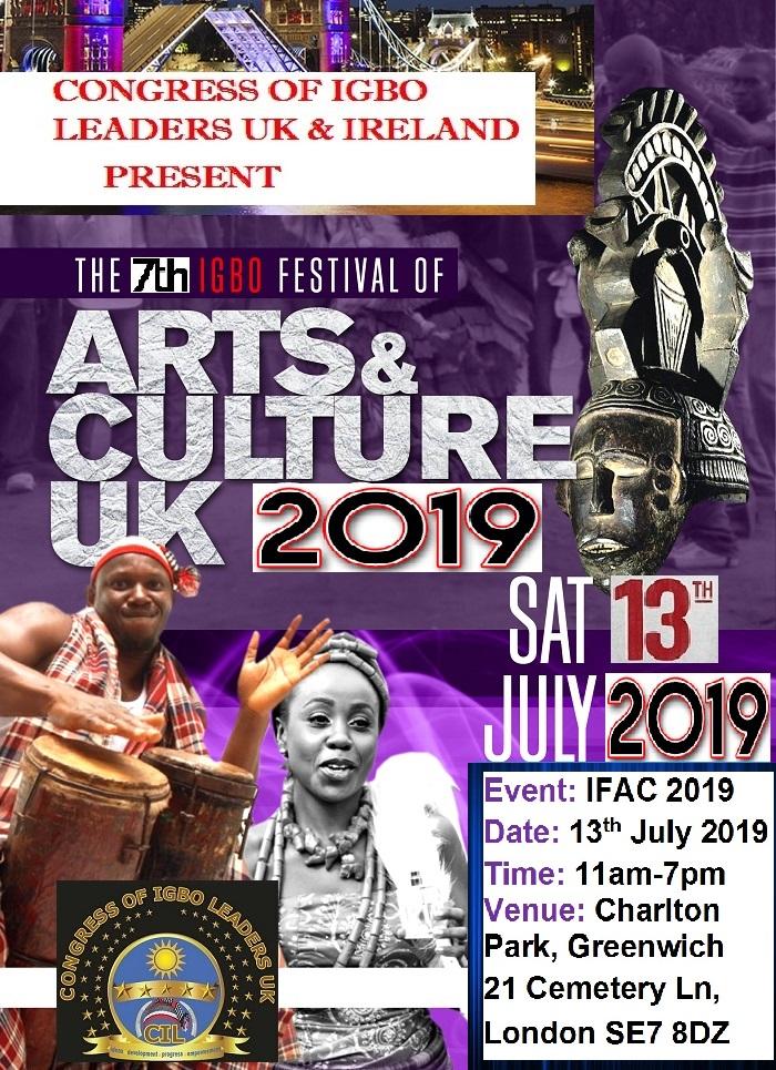 This festival is intended to afford the British community the rare opportunity to witness Igbo culture and tradition in its original form. The highlights of the event will include but not limited to Igbo cultural plays, traditional dances, performances by traditional artists, dance and drama, masquerades display, historical and traditional artefacts showcased in splendor.