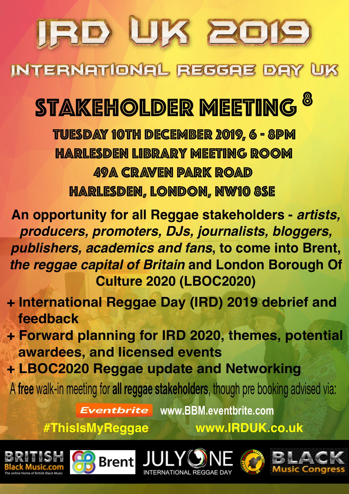 IRD Reggae Stakeholders Meeting 8 takes place in Harlesden Library Meeting Room on Monday Dec. 10, 6-8pm: Convened by Kwaku for BritishBlackMusic.com, UK co-ordinator of IRD (International Reggae Day). You’re advised to reach venue before 6pm, for a 6pm prompt start and we’ll be out of premises by 8pm.