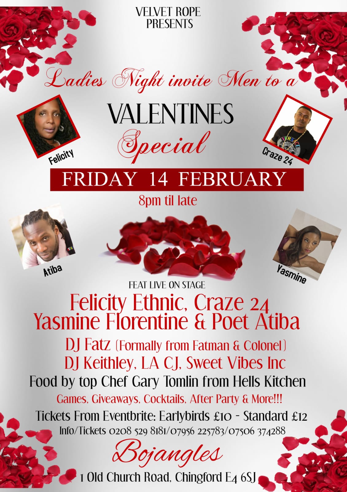 Velvet Rope Productions invites you to a special edition of their Ladies’ Night this Valentine’s Day at Bojangles Brasserie in Chingford!