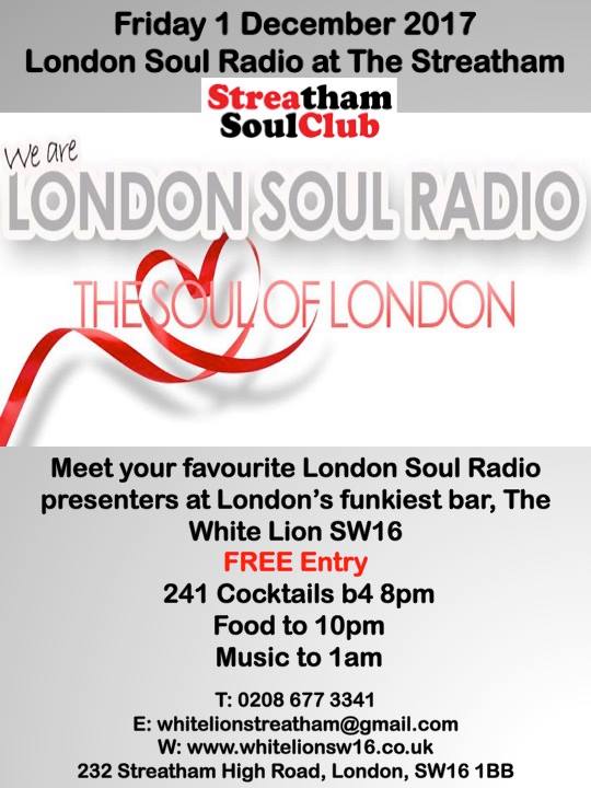 On Friday 1 December 2017 you can meet your favourite London Soul Radio presenters at London’s funkiest bar, The White Lion SW16!