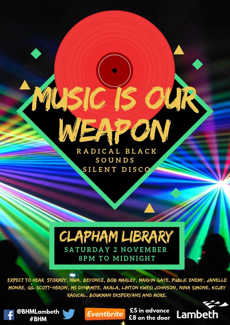Clapham Library Live teams up with BMT for a silent disco experience celebrating the very best of radical, revolutionary, rebel and protest music by black musicians. Pick your channel as DJs battle it out across the musical genres of blues, jazz, pop music, reggae, R&B and hip-hop. Expect to hear Stormzy, NWA, Beyoncé, Bob Marley, Marvin Gaye, Public Enemy, Janelle Monáe, Gil Scott-Heron, Ms Dynamite, Akala, Linton Kwesi Johnson, Nina Simone, Kojey Radical, Boukman Eksperyans and more.