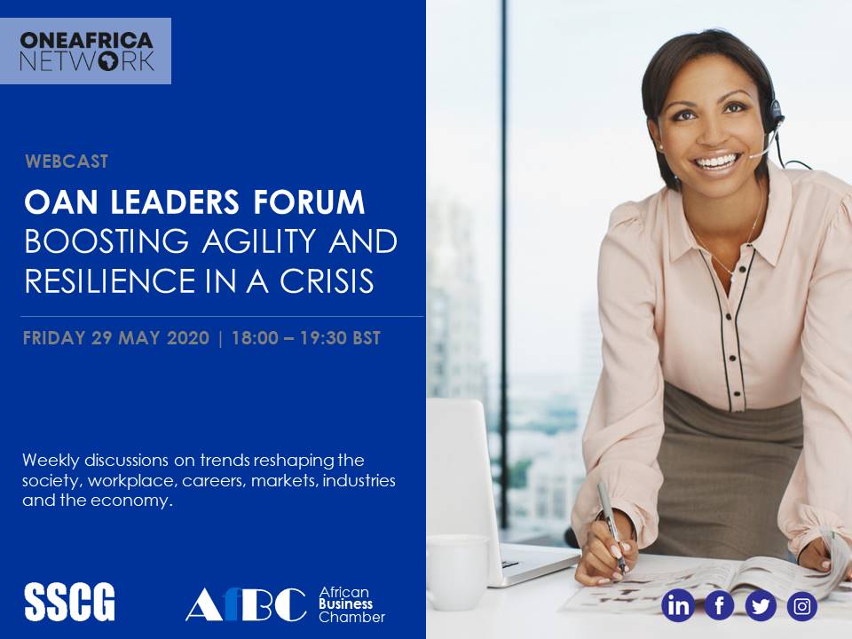 Join One Africa Network (OAN) Leaders Forum: Boosting Agility and Resilience live discussion webcast on Friday 29 May 2020 at 18:00 BST to learn and hear from our panel of experts and leaders. Connect and hear from other business leaders and professionals across the industries and regions on their experience and best practices. Gain insights, market updates and better understanding on some of the positives and opportunities arising from current rapidly evolving global economy, key priorities and where to direct the right focus.