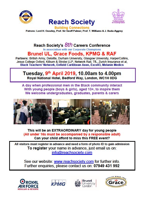 Reach Society is rolling out its annual FREE Careers Conference on Tuesday, 9 April 2019 from 10:00-16:00 at the Royal National Hotel, 38-51 Bedford Way, London WC1H 0DG.