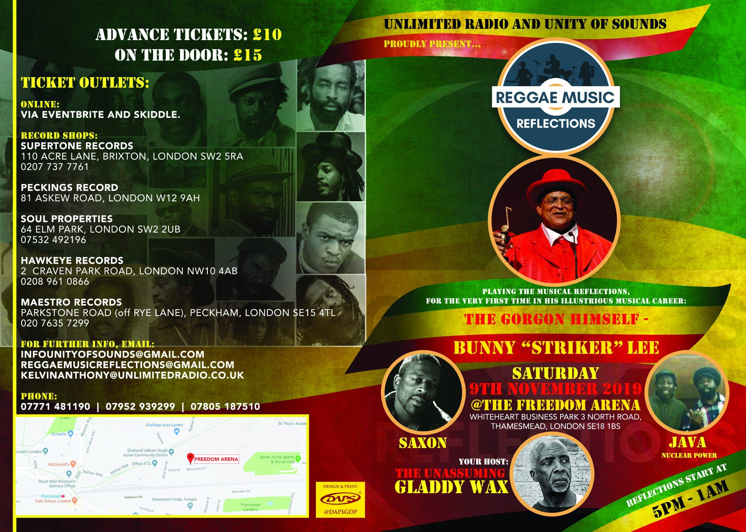 Saxon studio, Java nuclear both using their own sound systems, when was the last time these two played together? Bunny striker lee playing a tribute to our legends and contributors to the reggae industry, Gladdy Wax as the host, I can only guess the years of musical knowledge between them all. “REGGAE MUSIC REFLECTIONS” Sat 9th Nov in Thamesmead lets make history together, tickets available eventbrite & skiddle
