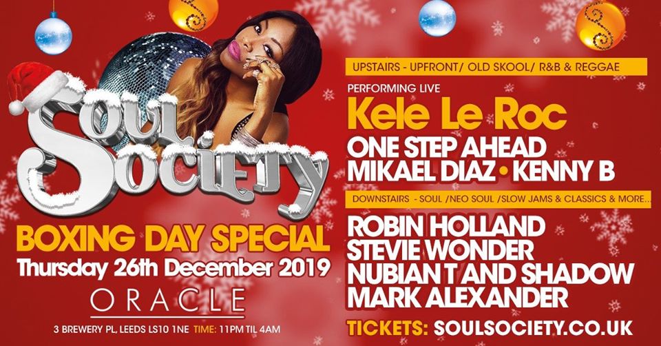 Christmas is coming and for the first time ever, Soul Society are celebrating Boxing Day in ultimate style at Leed’s largest waterfront venue Oracle. What better way to get into the festive spirit than at this amazing Christmas party taking place in a beautiful venue split over 2 levels with fabulous grown and glamorous soul lovers. Join us for this unmissable night which brings you a host of fantastic DJs and special guest artist Kele Le Roc who will be performing her MOBO award winning smash hit single “My Love” along with all her greatest hits.
