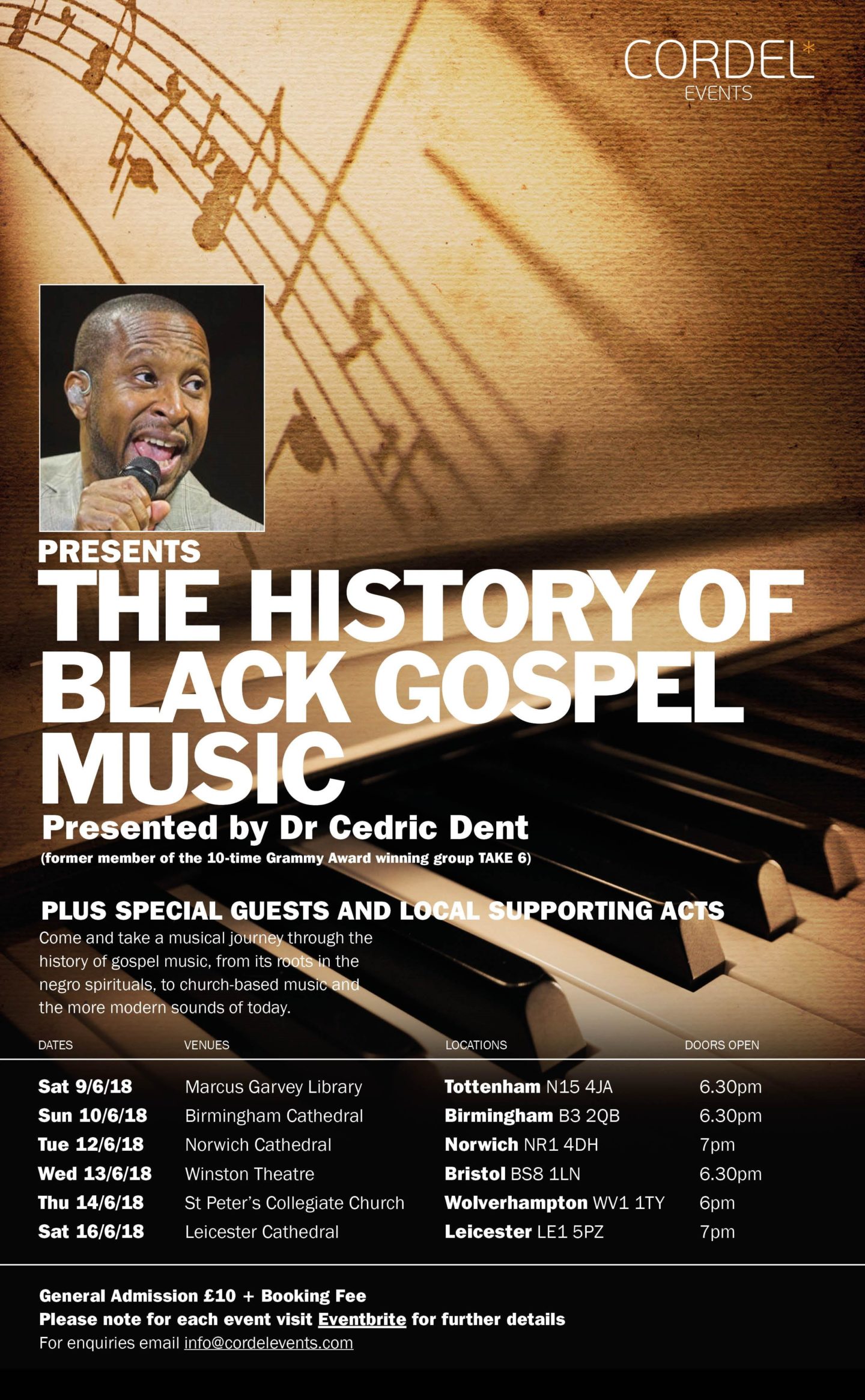 Come and take a musical journey through the history of gospel music, from its roots in negro spirituals, to church-based music and the more modern sounds of today. Gospel music is one of the most important of all music genres with influences in blues, jazz and rock and roll. Sing hallelujah as you learn about the key pioneers of gospel! Grammy award winning TAKE 6 legend Dr Cedric Dent, is the presenter of “The History of Black Gospel Music”!