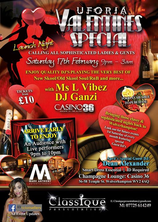 Classique Presentations presents ‘Uforia’ a Valentines Special taking place on Saturday 17th February 9pm to 3am @ Luxurious Champagne Lounge, Casino36, 56-58 Temple Street, Wolverhampton. WV2 4AQ. Playing the very best in Soul & RnB providing a platform for love and harmony in stunning surroundings with sophisticated Ladies & Gents.