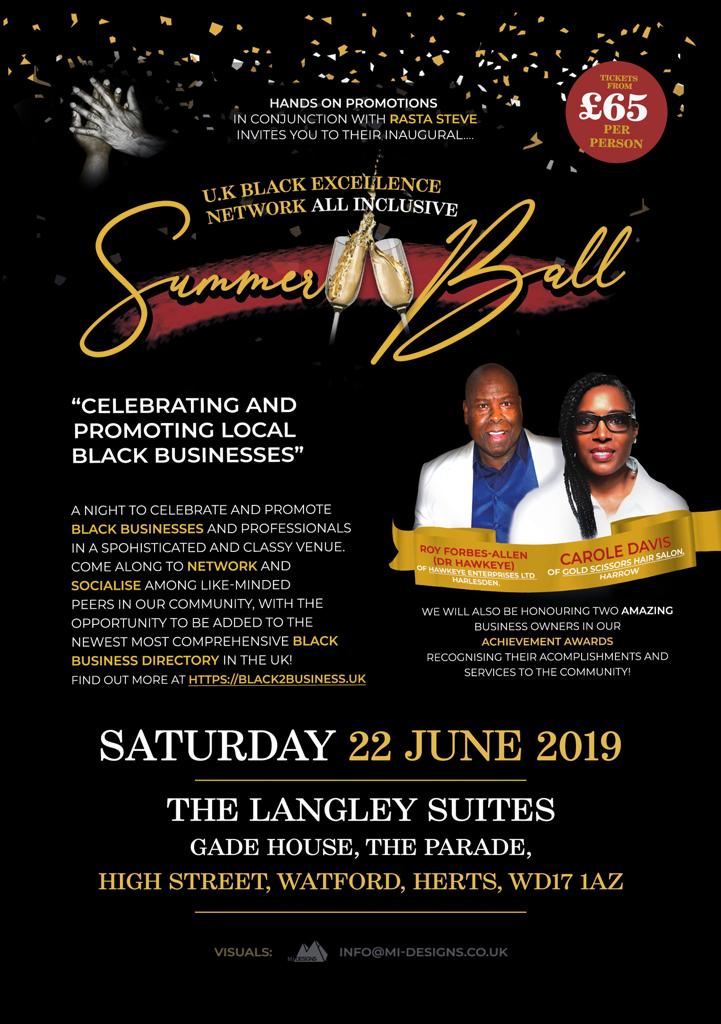 A night to celebrate and promote black businesses and professionals in a sophisticated and classy venue. Come along to network and socialise among like-minded peers in our community; with the opportunity to be added to the newest, most comprehensive Black Business Directory in the UK! Find out more at https://black2business.uk We will be honouring TWO amazing business owners in our achievement awards recognising their accomplishments and services to the community. Ticket price covers: Admission, Food, Drink, and Entertainment. Plus free car parking! Live PA’s on the night include Frenchie King and SeSe Foster – an X Factor contestant! Cocktail hour – 7pmDinner and Dance – 8pm sharp – late Dress code – Black Tie. Tickets – £65 including ALL DRINKS ALL NIGHT!