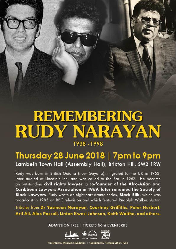 Rudy was born in British Guiana (now Guyana), migrated to the UK in 1953, later studied at Lincoln’s Inn, and was called to the Bar in 1967. He became an outstanding civil rights lawyer, a co-founder of the Afro-Asian and Caribbean Lawyers Association in 1969, later renamed the Society of Black Lawyers. Rudy wrote an eight-part drama series, Black Silk, which was broadcast in 1985 on BBC television and which featured Rudolph Walker, Actor.