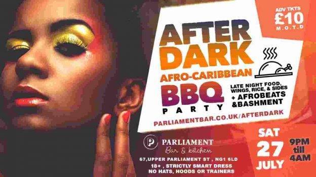 After Dark Afro-Caribbean BBQ Party. Sat 27th July, 9pm – 4am at Parliament Bar & Kitchen NG1 6LD Strictly Smart Dress, No Hats, Hoods or Trainers,…