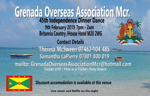 45th Independence Grenadian Overseas Association Mcr Dinner Dance 2019 Date – 09.02.2019 Time – 19.00 – 2.00am Price : £49.00 Venue: Britannia Hotel in Didsbury Palatine…