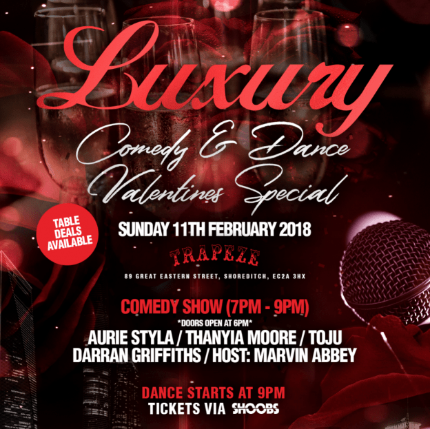 LUXURY BRINGS YOU A NIGHT OF LAUGHER AND EXCITEMENT. COMEDY SHOW (7PM – 9PM) ───────────────── AURIE STYLATHANYIA MOORETOJUDARREN GRIFFINS HOST: MARVIN ABBEY DANCE (9PM – LATE) *RNB, DANCEHALL, AFRO…