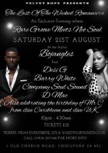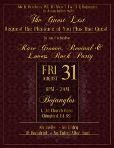 On Friday 31st August, Bojangles in Chingford E4 are having an exclusive Rare Groove, Revival & Lovers Rock party which is strictly by invitation only.…