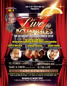 MR B of Venture FM PRESENTS LIVE @ BOJANGLES Not just the usual dance but his yearly Sagittarian Birthday Show & Party including: A Quality…