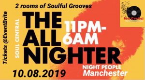 Soul Central – THE ALL NIGHTER The All Nighter returns to Manchester with 2 Rooms of Soulful Grooves on Sat 10th August 2019 from 11pm…